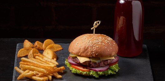 Булочка бриошь, мясная котлета поджаренная на углях(говядина), омлет , фирменных соуса, маринованный лук, лист салата, помидор, маринованный огурец ломтик сыра.